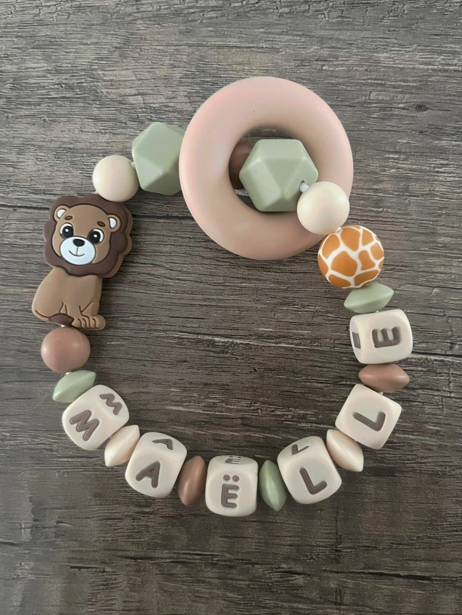 ANNEAU DE DENTITION HOCHET BÉBÉ PERSONNALISÉ AVEC PRÉNOM AU CHOIX THÈME LION SAVANE TIGRE BEIGE KAKI – LETTRES EXCLUSIVITÉ BEIGE CHAIR CHOCOLAT GLACÉ