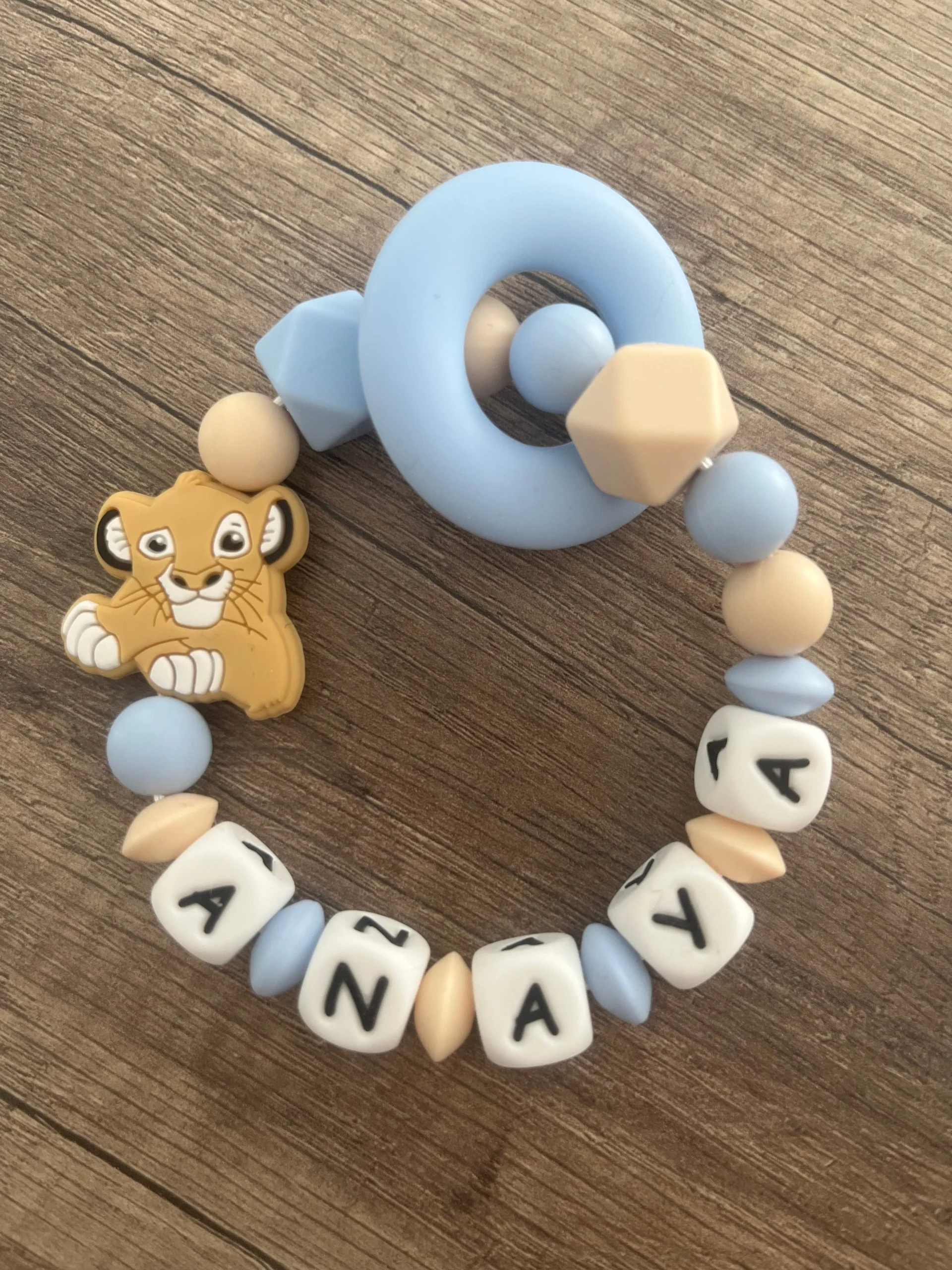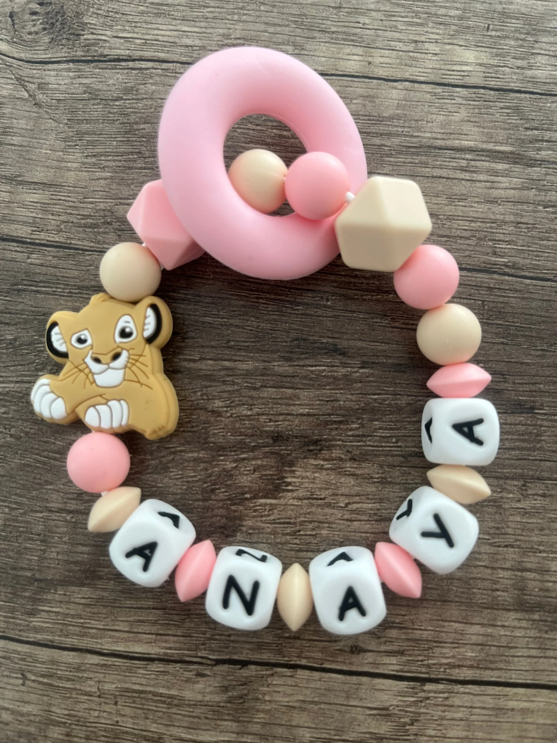 ANNEAU DE DENTITION HOCHET BÉBÉ PERSONNALISÉ AVEC PRÉNOM AU CHOIX THÈME DISNEY ROI LION SIMBA NALA TIGRE BEIGE KAKI ROSE BLEU