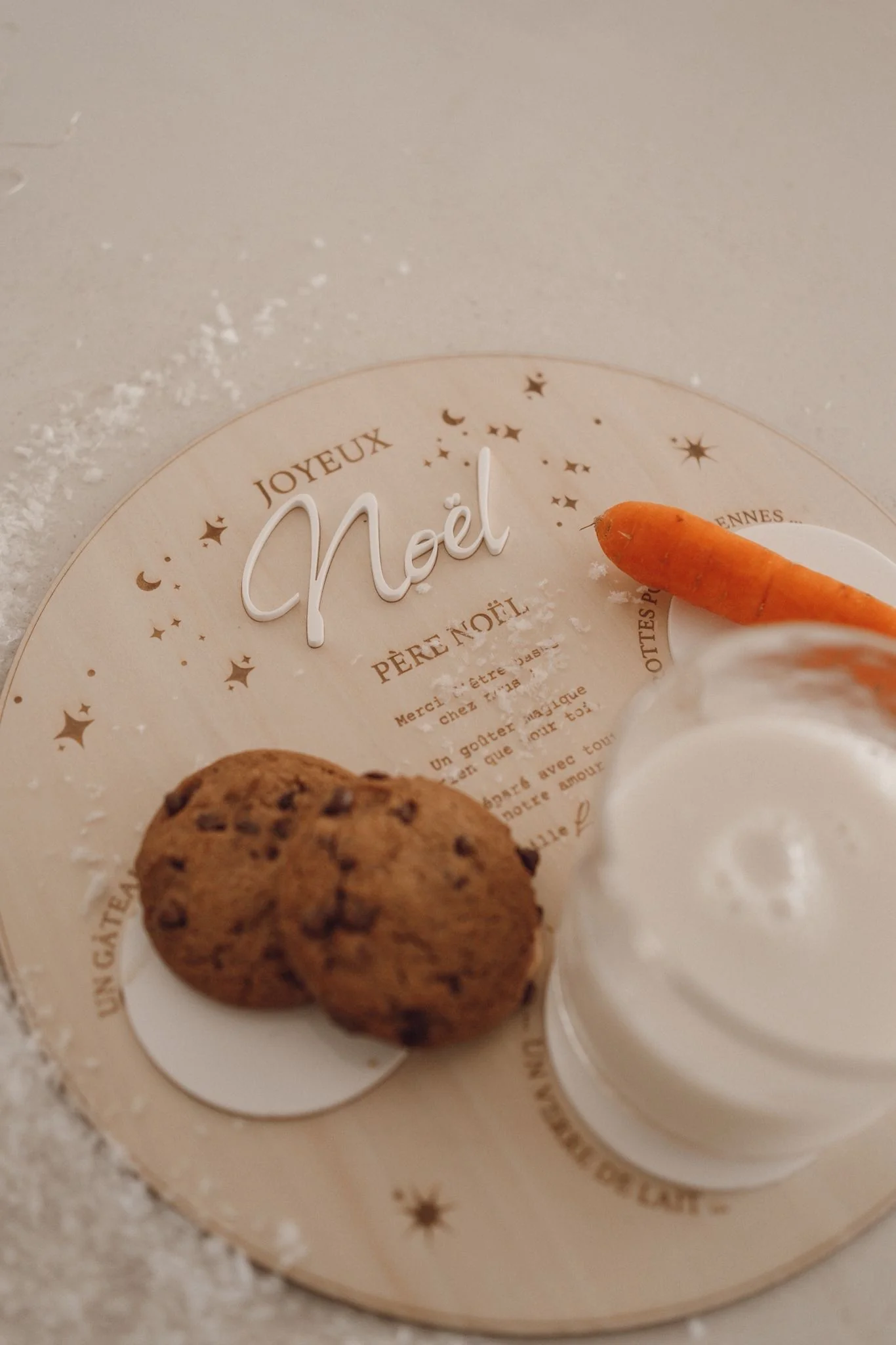 Sortez l’assiette pour le père Noël et ses rennes le soir de Noël et mettez y tous les ingrédients nécessaires. En bois et gravure Rond blanc en acrylique lavable Choisissez la couleur du mot « Noël » Dimensions : 27x27cm