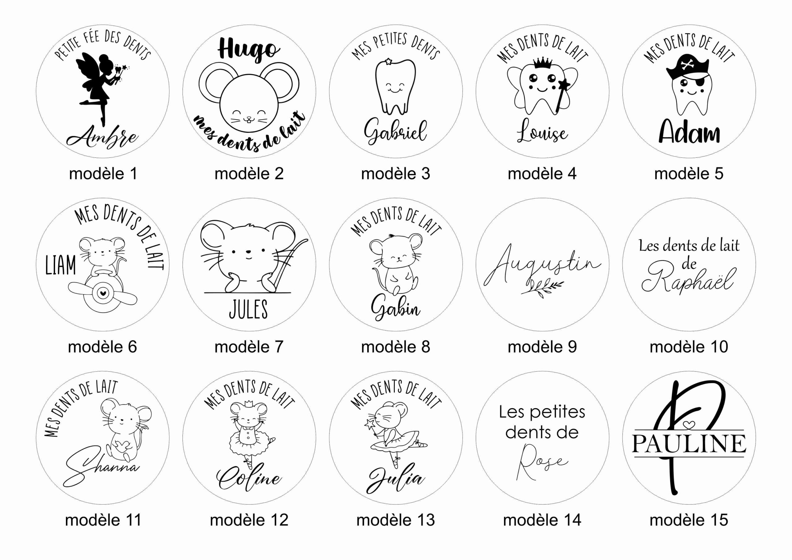 Pour personnaliser votre boîte à dents, veuillez indiquer le prénom de l’enfant et le numéro du modèle choisi dans la case « personnaliser ».