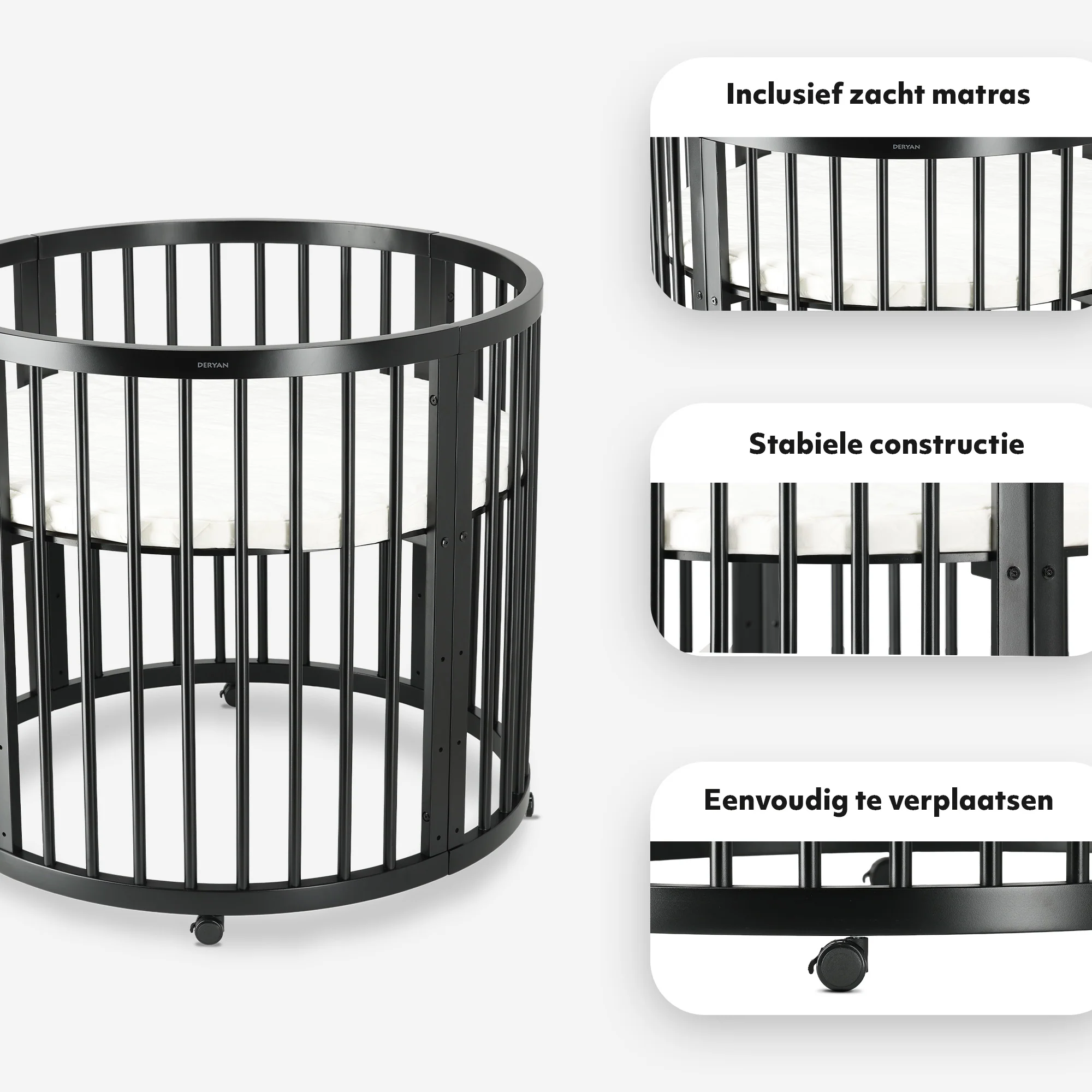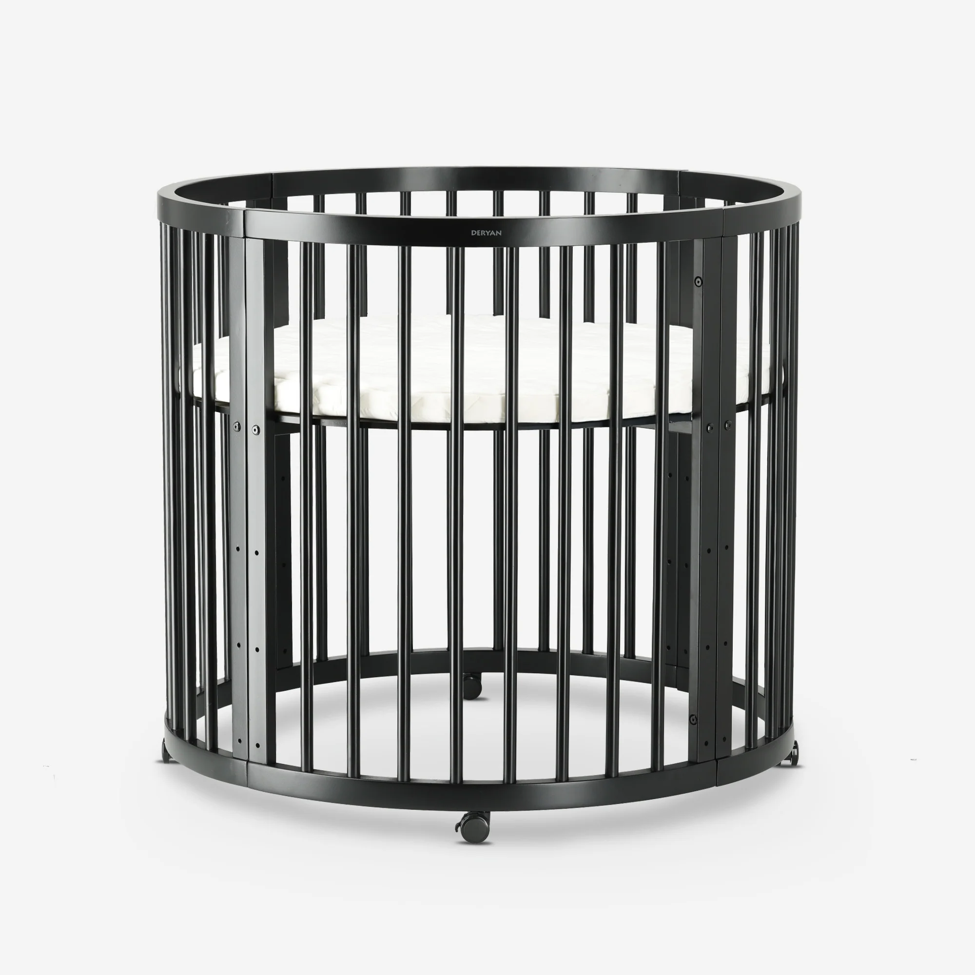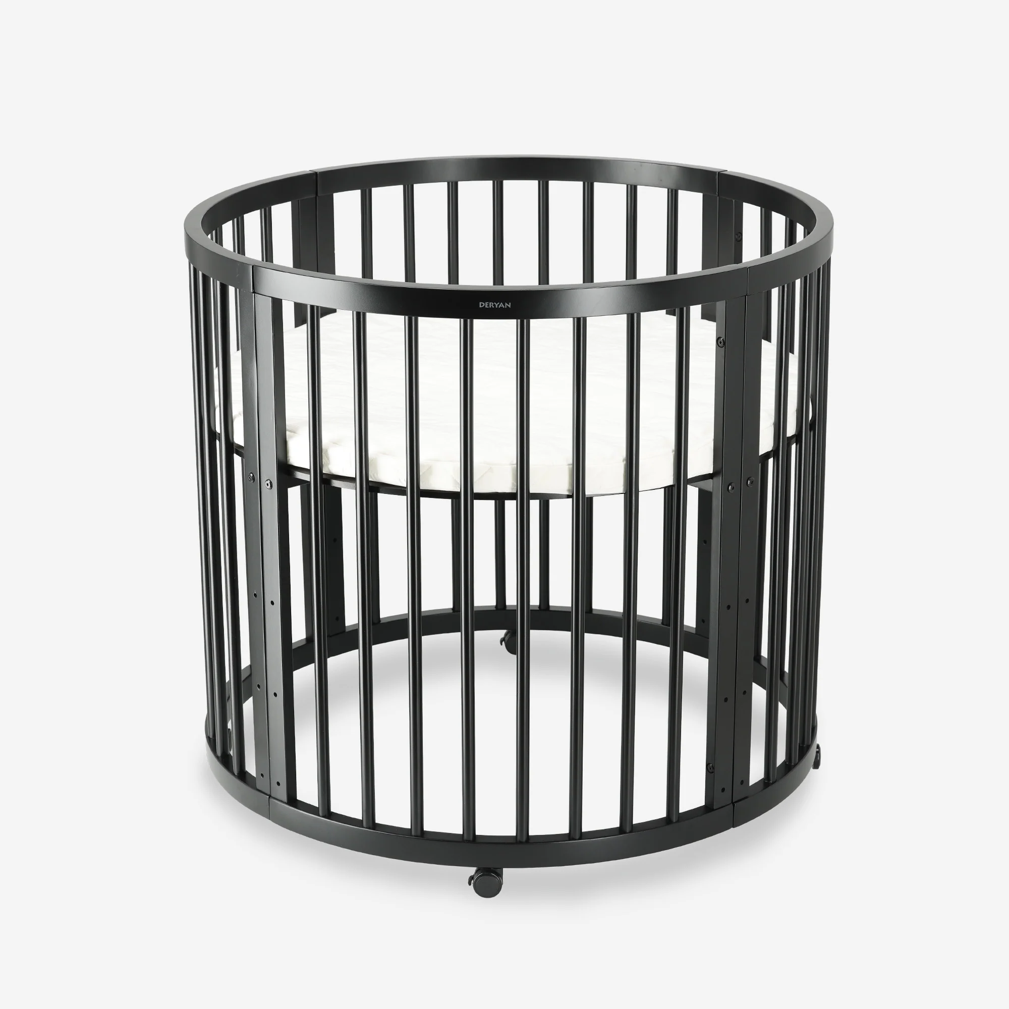 La boîte à saule DERYAN est une boîte ronde en bois. y compris le matelas et roues, conçue pour être à la fois pratique et élégante. Idéale pour les bébés et les enfants en bas âge, elle attire tous les regards dans une pièce moderne grâce à sa finition noire.