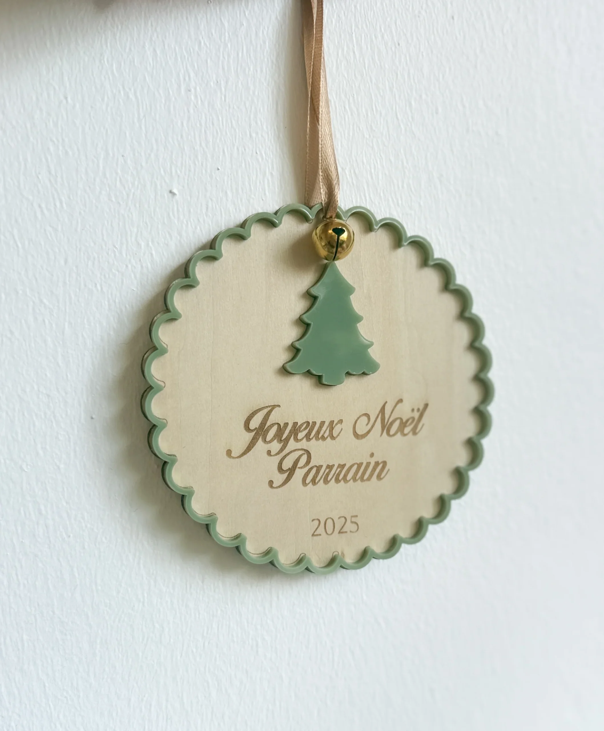 Une jolie suspension avec le motif et message de votre choix, marraine, parrain, nounou, maîtresse ….. Un mélange de bois et d’acrylique, et un ruban assorti à votre décoration Dimensions : 10,5×10,5cm Motif au choix : Noeud, Etoile, Sapin, Cadeau