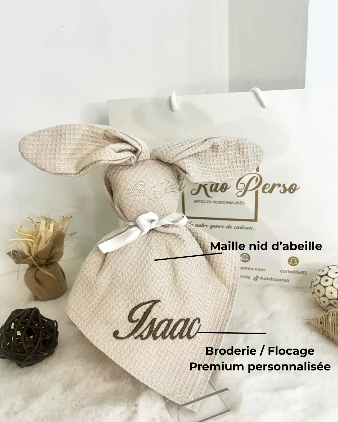 Doudou Premium en tissu nid d’abeille , personnalisée avec une broderie élégante au prénom de votre choix . Un cadeau unique, doux et pratique pour des nuits sereines.