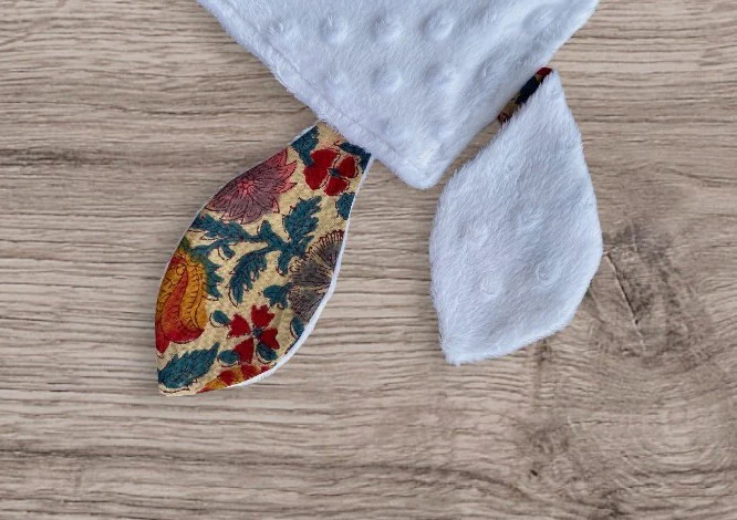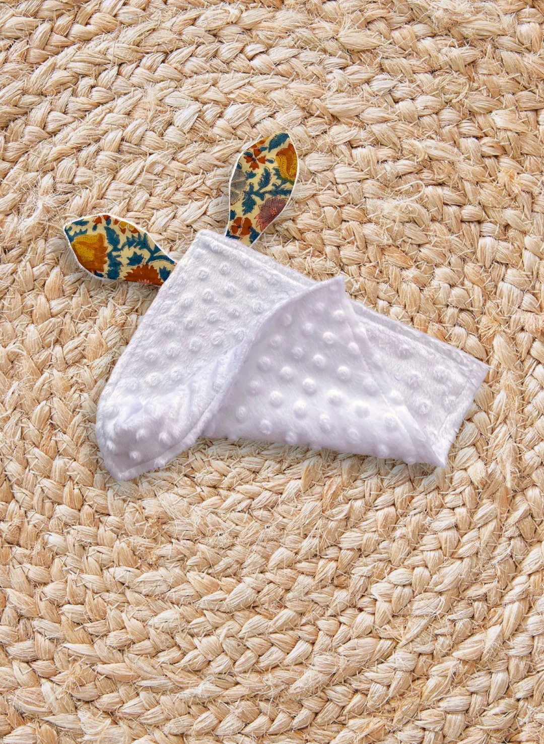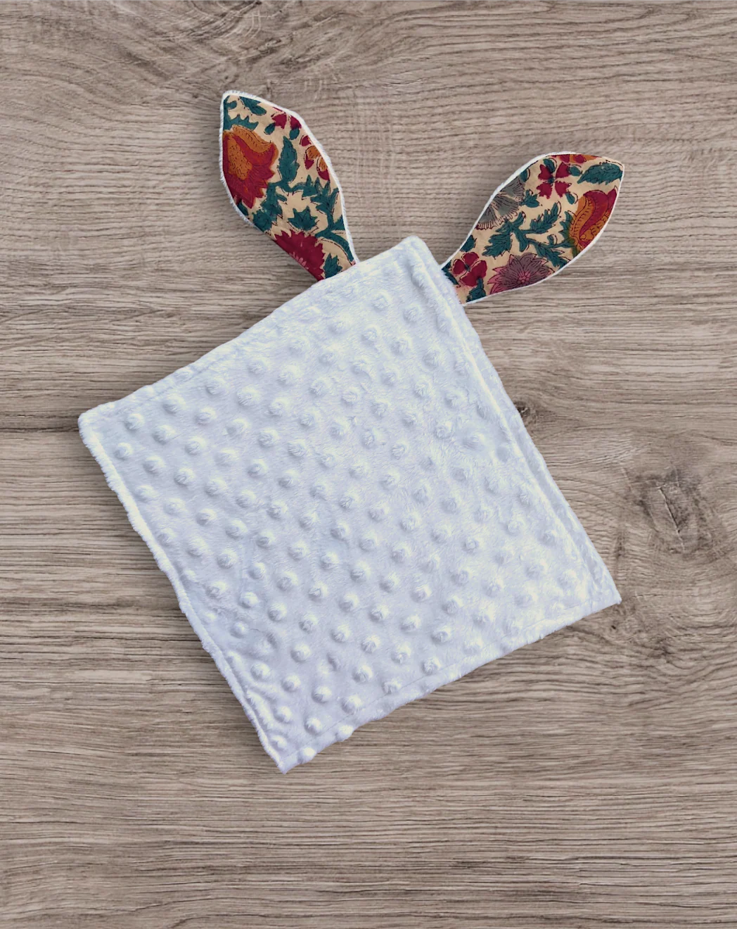 Ce joli doudou est un grand carré doudou oreille de lapin d’environ 25X25 cm, confectionné en éponge bambou toute douce avec des oreilles en coton décoré de tissu « block-print ». Ses grandes oreilles permettent à bébé de pouvoir le manier et jouer facilement avec.