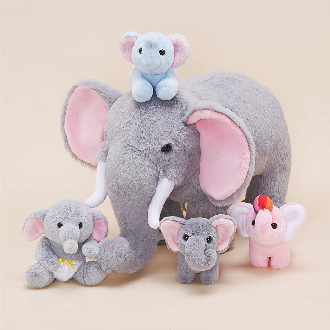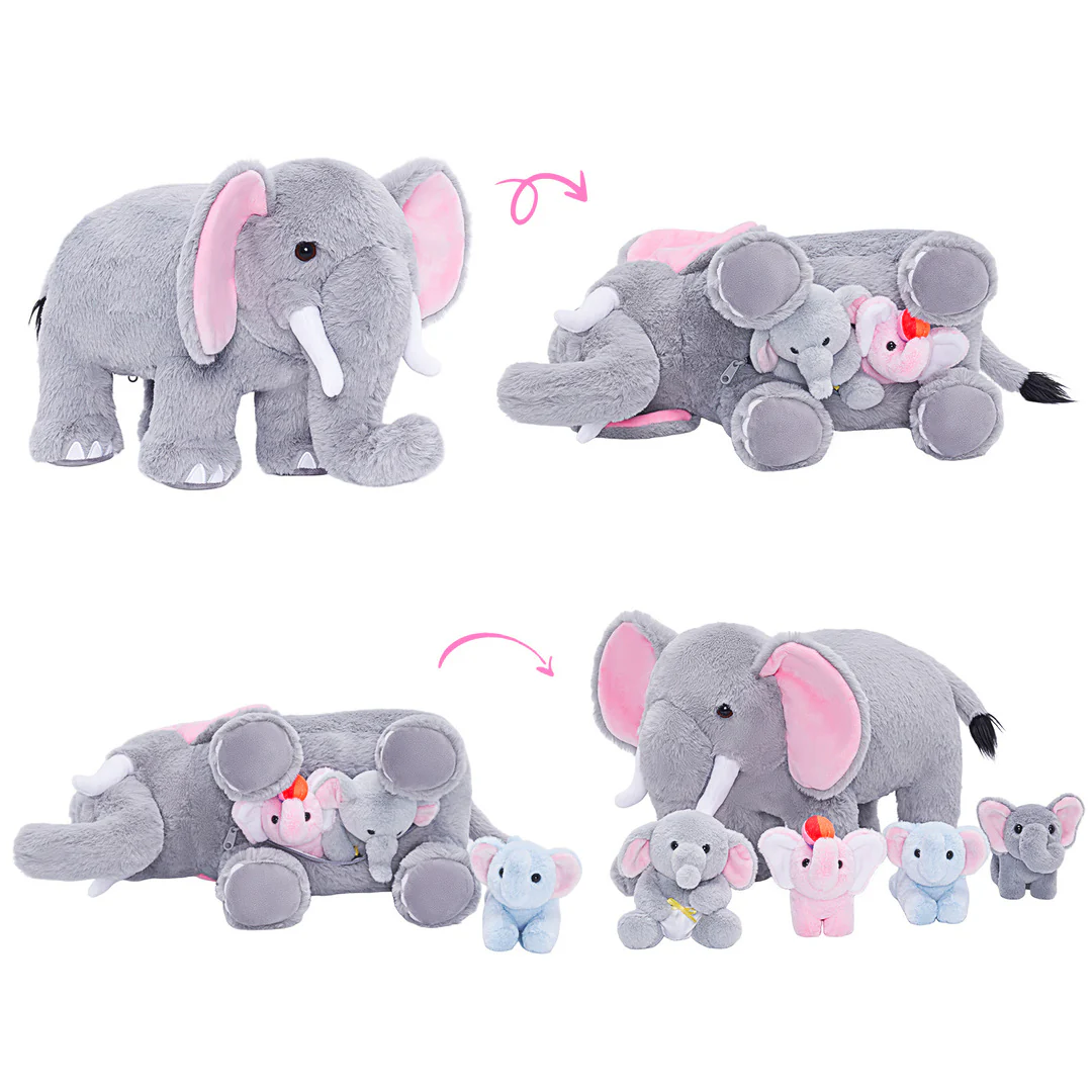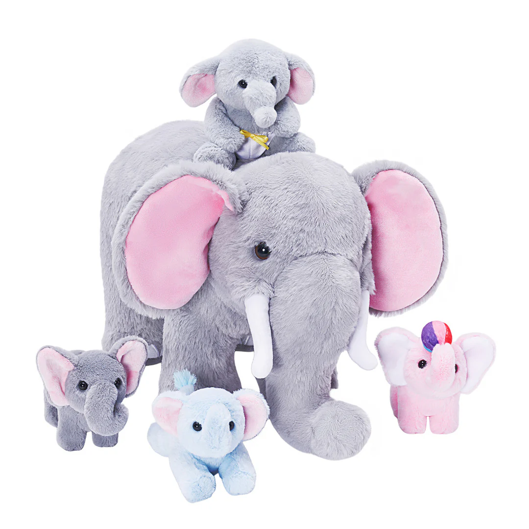 Cet ensemble de jeu doux comprend un sac éléphant en peluche de 21 cm pour ranger 4 bébés éléphant doux,