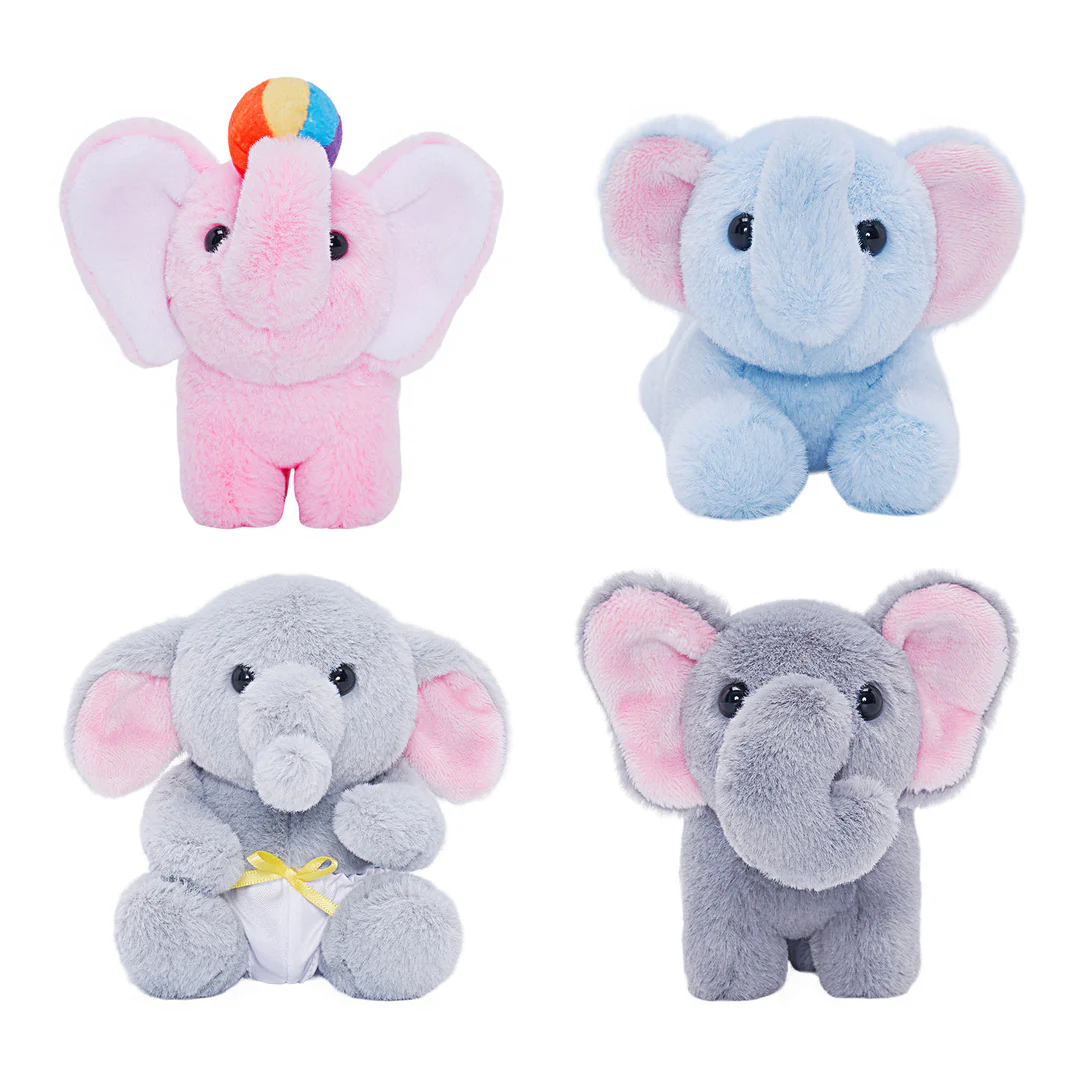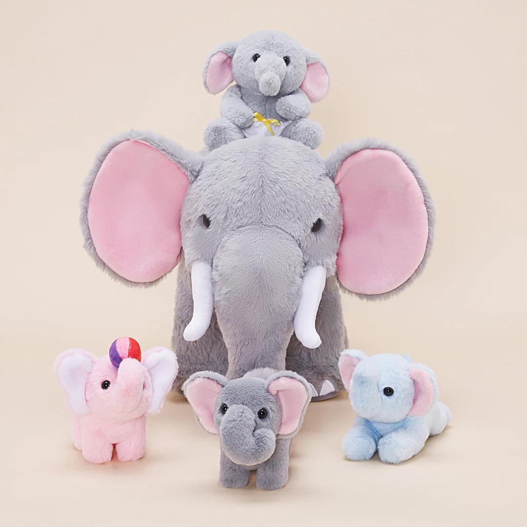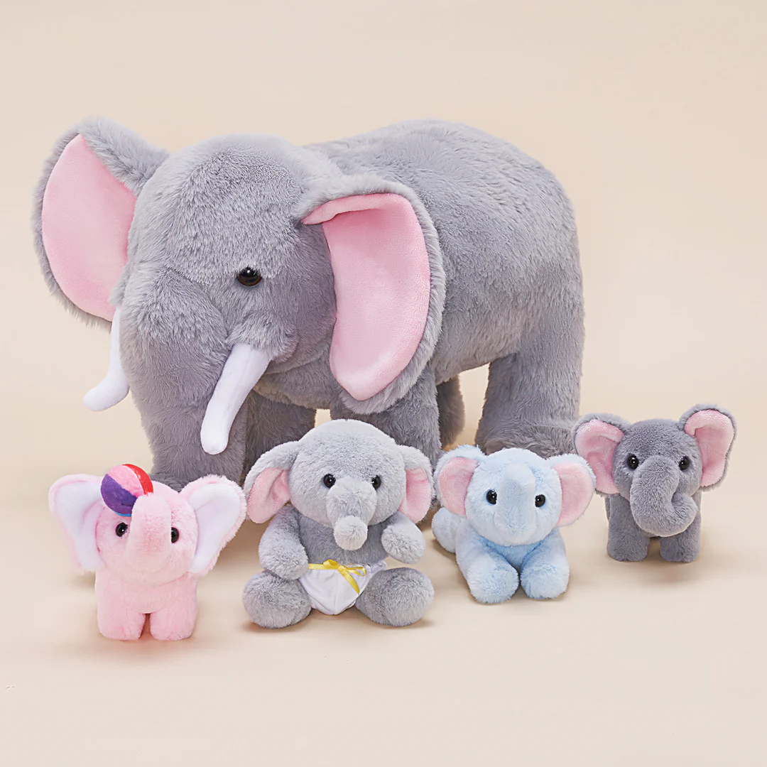 Cet ensemble de jeu doux comprend un sac éléphant en peluche de 21 cm pour ranger 4 bébés éléphant doux,