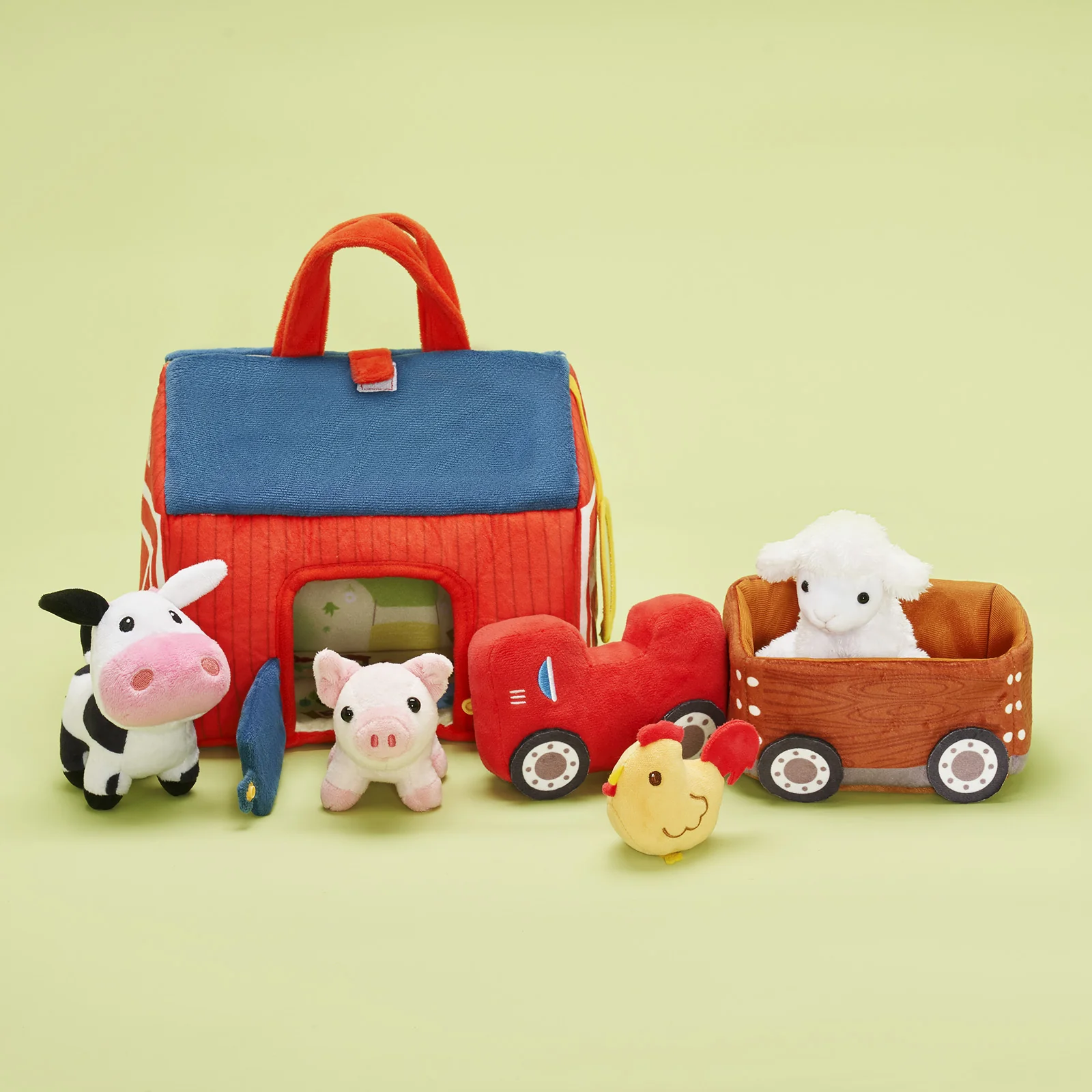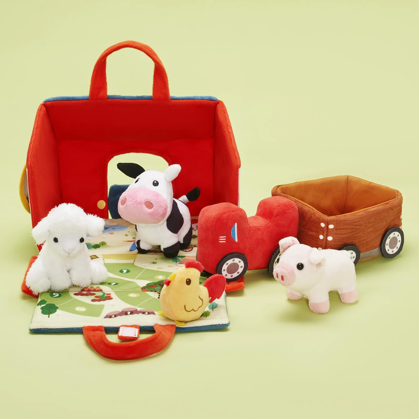 Cet ensemble de jouets en peluche comprend une maison de ferme portable en peluche de 26 cm, une petite remorque de ferme et 4 animaux en peluche : un mouton blanc comme neige, un poussin mignon, une vache amusante et un cochon rose ;