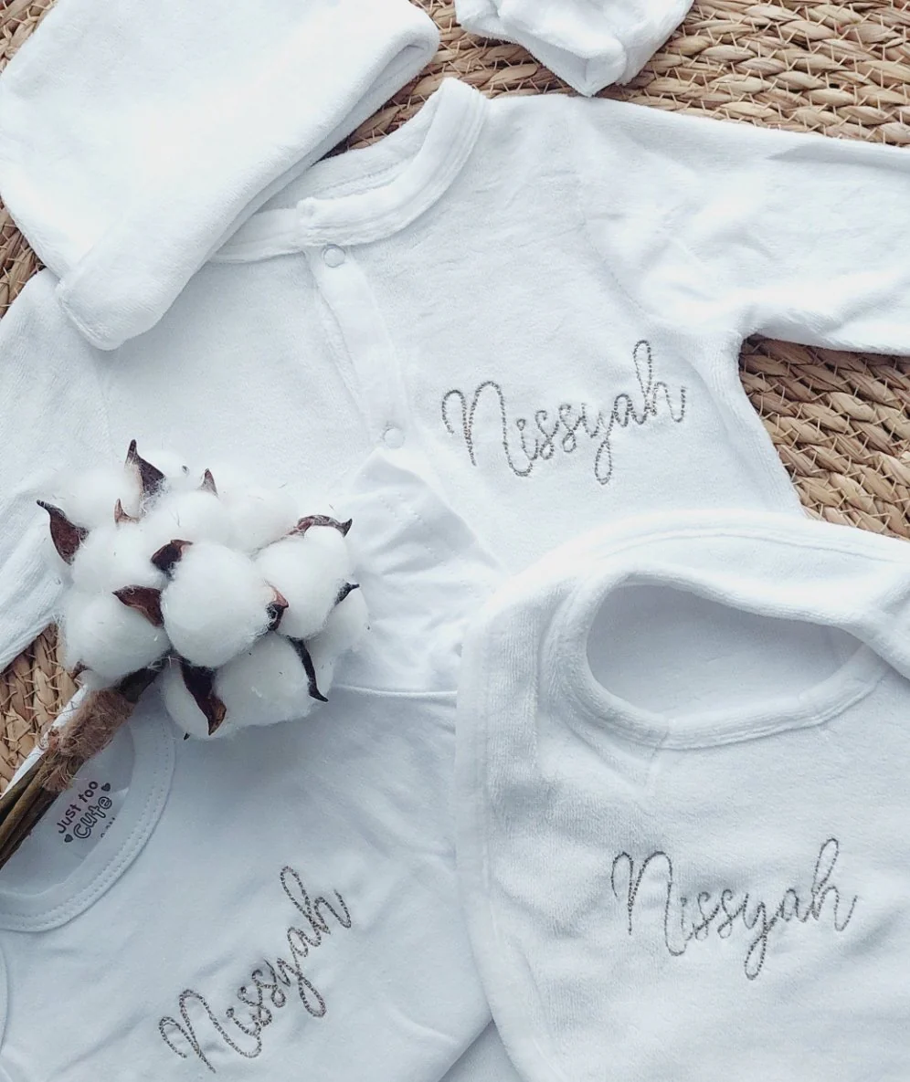 - Le bavoir, le body et le pyjama sont personnalisables avec le prénom de bébé.