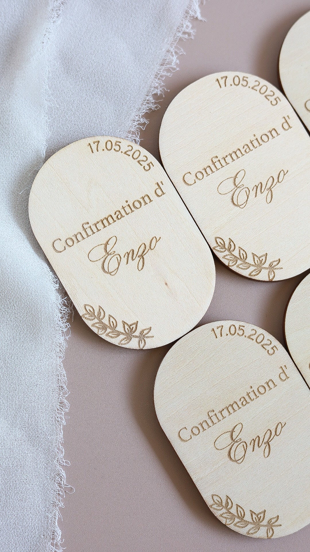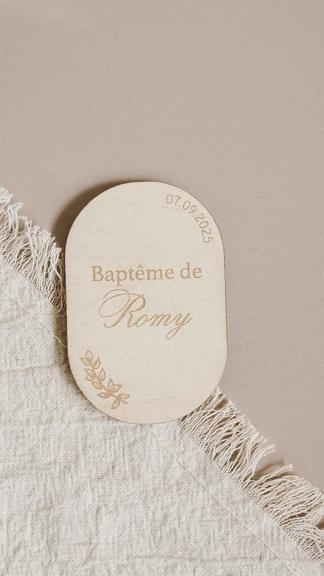 Optez pour ces jolis magnets en bois gravés et acrylique en souvenirs d’un baptême, en faire part, ou en cadeaux invités.