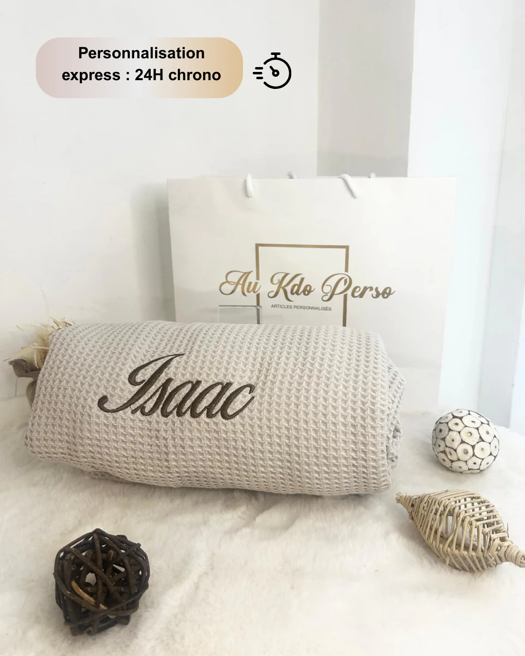 Plaid en tissu nid d’abeille respirant, personnalisée avec une broderie élégante au prénom de votre choix . Un cadeau unique, doux et pratique pour des nuits sereines.