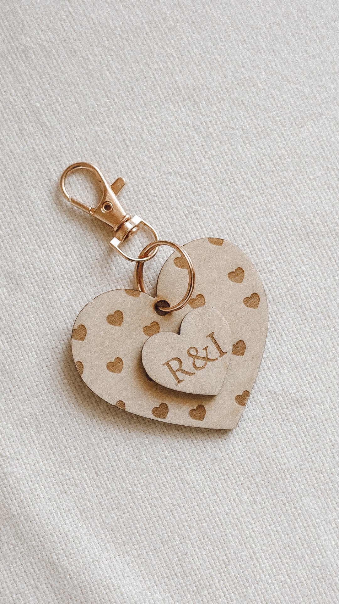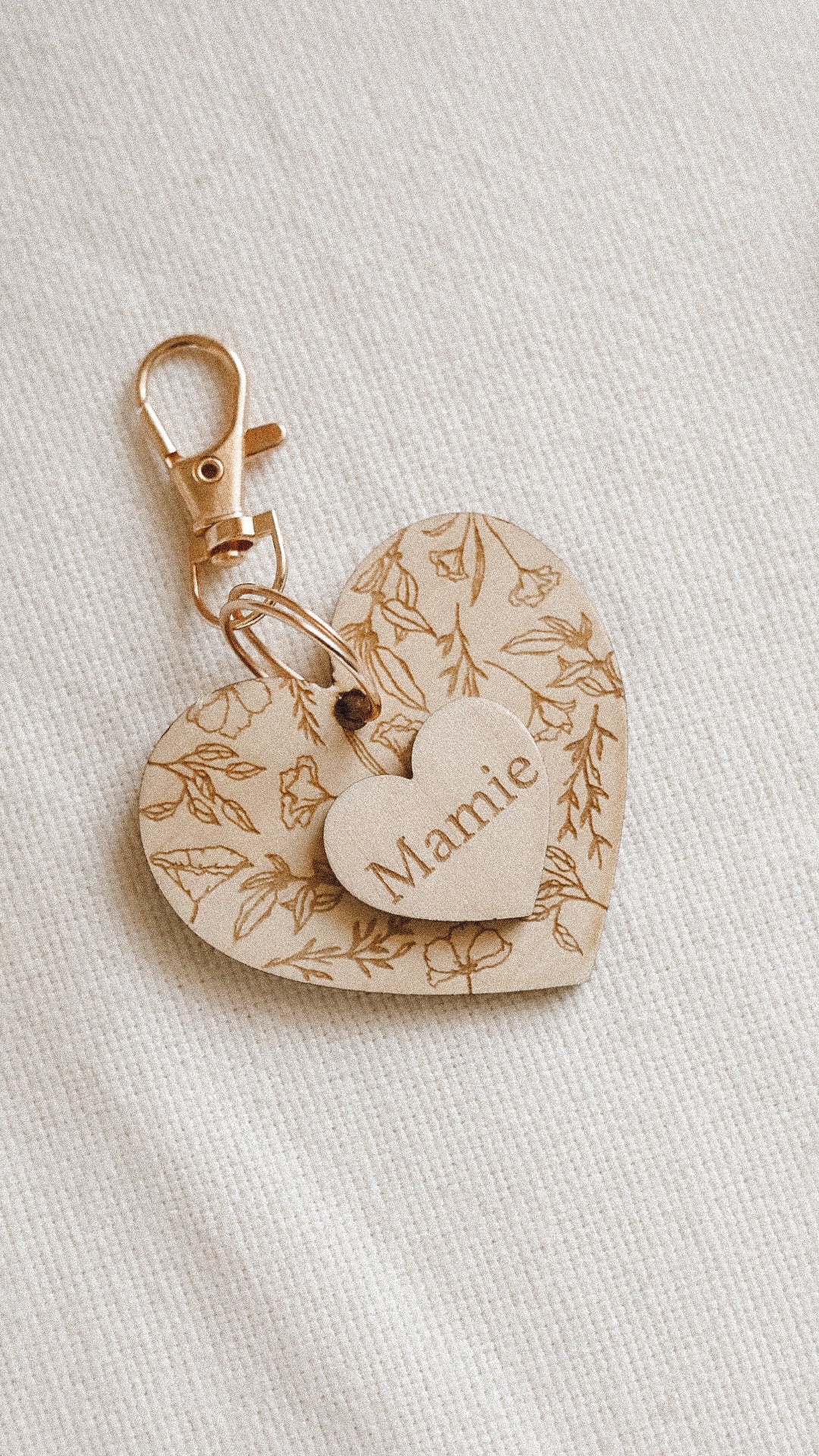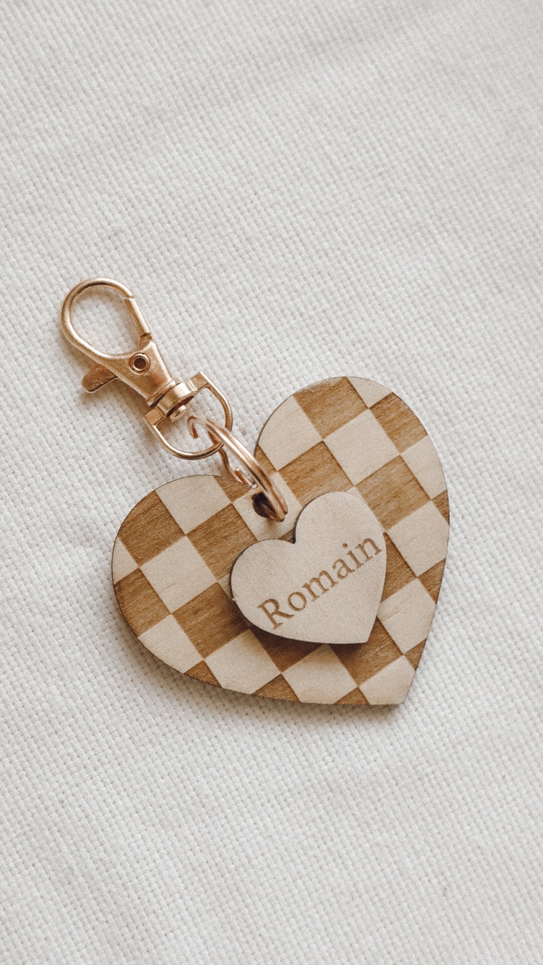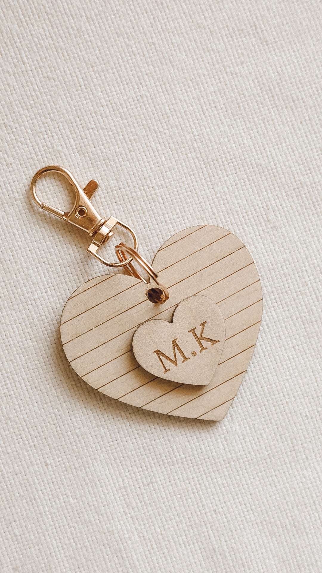 L’accessoire indispensable naturel à offrir ou pour vous même. 4 Modèles sont proposés Bois naturel et personnalisation en gravure sur une face. Mousqueton et anneau doré Possibilité de commander en gros (sur devis) personnaliser le mini cœur
