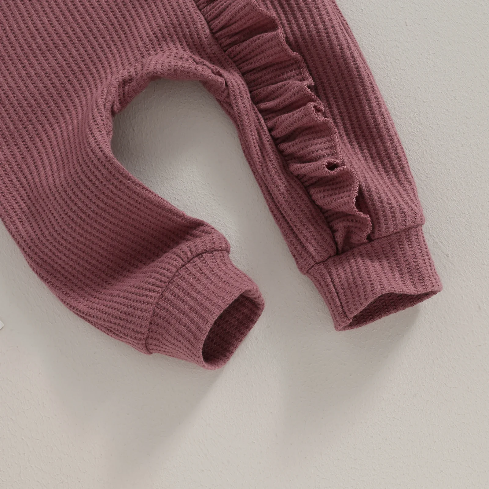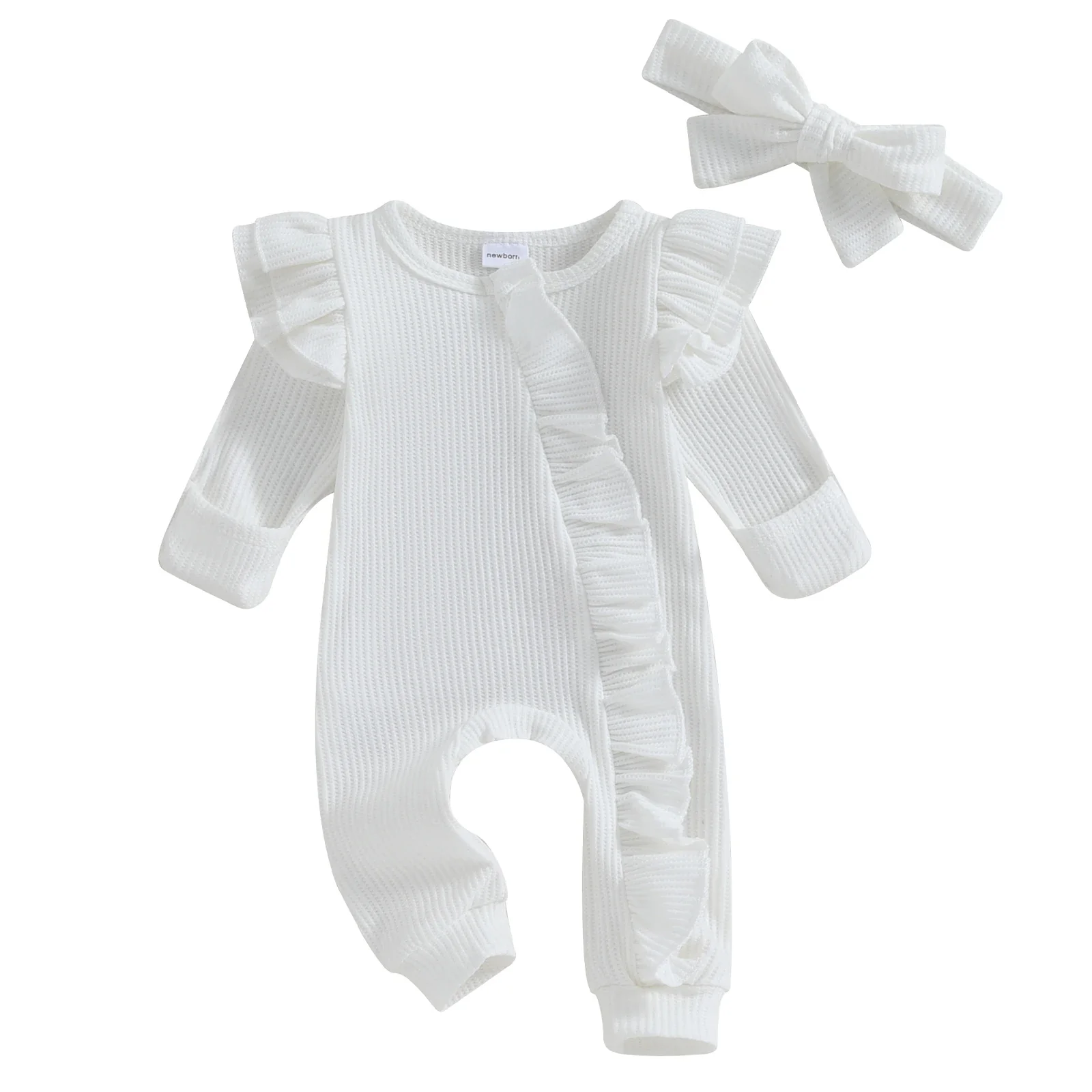 Combinaison d’automne pour bébé fille avec couleur unie, col rond, manches volantes et barboteuse à fermeture éclair ornée de volants, accompagnée d’un bandeau à nœud.